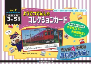 養老鉄道では、鉄道のルールやマナーについて楽しく学んでいただくことを目的に、小学生以下のお子さまを対象とした「ようてつでんしゃコレクションカードVol.7」を配布しています。また、引き続き「ようてつでんしゃコレクションカード」Vol.1からVol.6も配布しております。(なくなり次第終了)